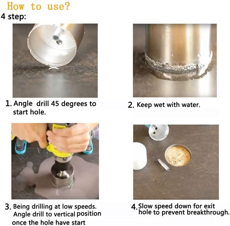 • IDEAL FOR: This diamond coated core drill bit removes a complete circle from glass, marble, tiles,granite, ceramic or other.Reduced drill speeds, low drill pressure and increased use of water lubrication will extend drill bit life considerably.